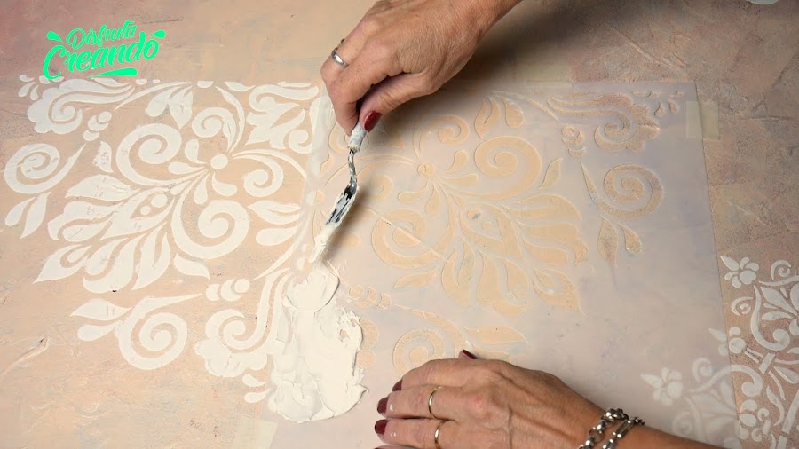Empleando una espátula se distribuye en forma homogénea por todo el stencil, en el grosor que le quieran dar y van sacando el exceso.