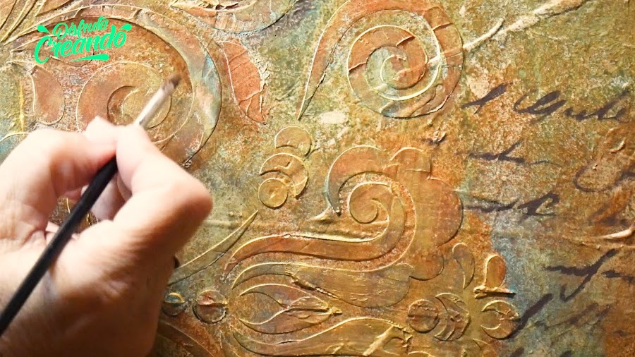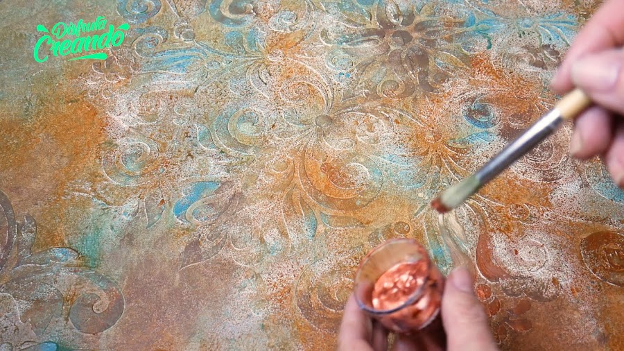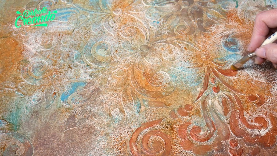 Se van matizando los colores turquesa, cobre, marrones y el cuadro va tomando aspecto de envejecido.