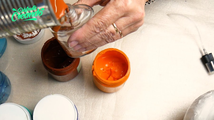 Ahora voy a mezclar siena calcinada con amarillo oro, lo mezclo en un recipiente y voy agregando agua y mezclando, tiene que estar bastante líquido para que pase por el spray, cuando lo tengo lo coloco dentro del envase y agito.