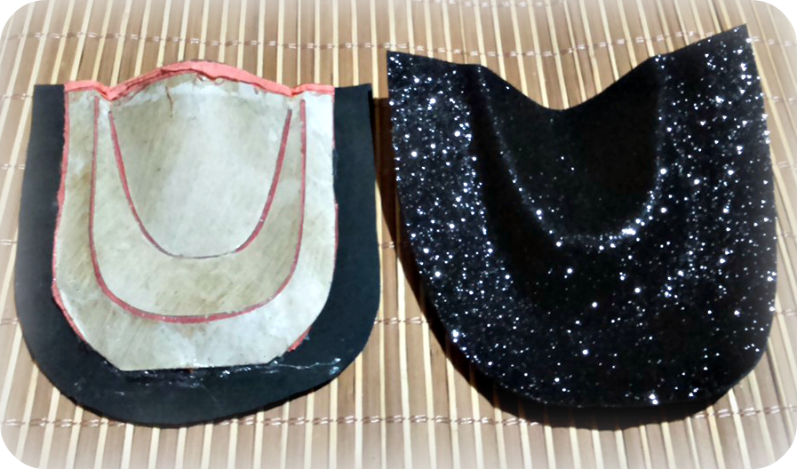 En las piezas laterales , pegaré la goma eva por la parte exterior y lo cortaré al ras del patrón y por la parte interior pegaré la tela , en la parte superior le hago una bastilla para que vaya bien rematada y al resto le dejo un sobrante de no menos 1,5 cm aproximadamente