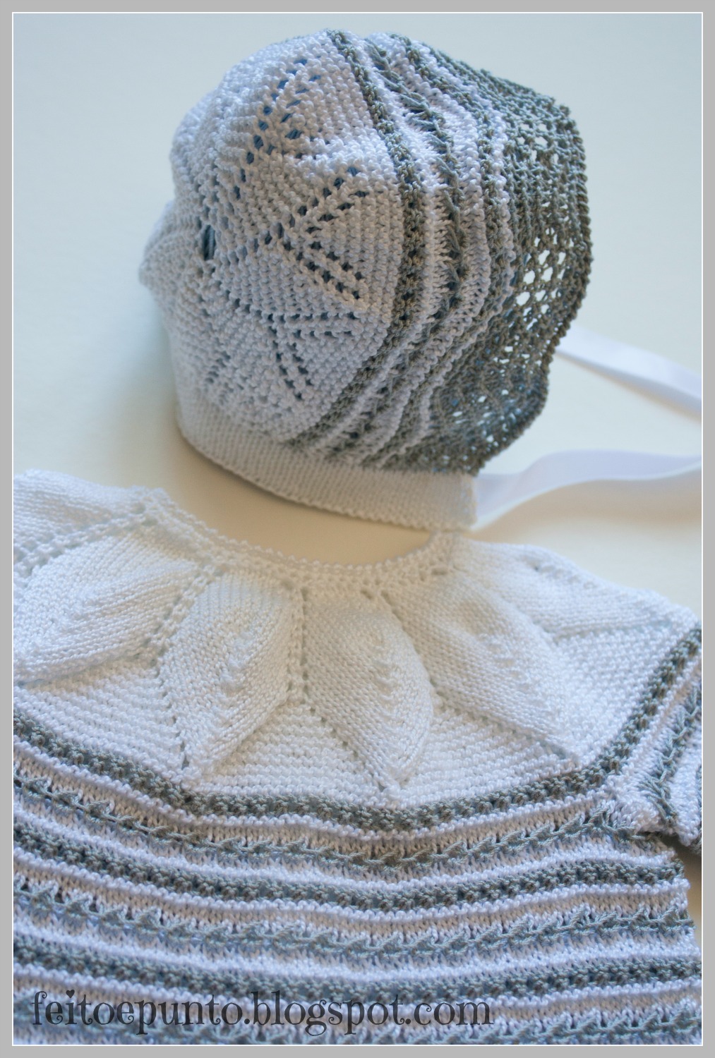 Ahora tejemos 7 vueltas a punto bobo en perlé blanco, y una vuelta a punto bobo en perlé gris.