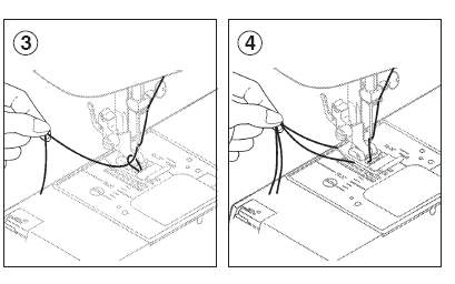 4.- Tiramos de ambos hilos juntos, hacia atrás de la máquina, por debajo del pie del prensatelas , dejando unos 15 cm de hilo.