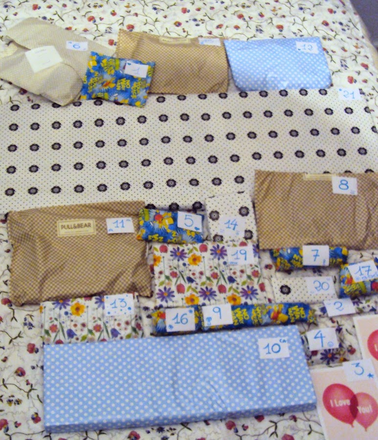 - Como veis en la siguiente foto, he puesto encima de la cama 21 regalos, envueltos de formas y papeles diferentes entre sí, aunque el contenido de algunos sea muy similar, para despistar un poco al subconsciente.