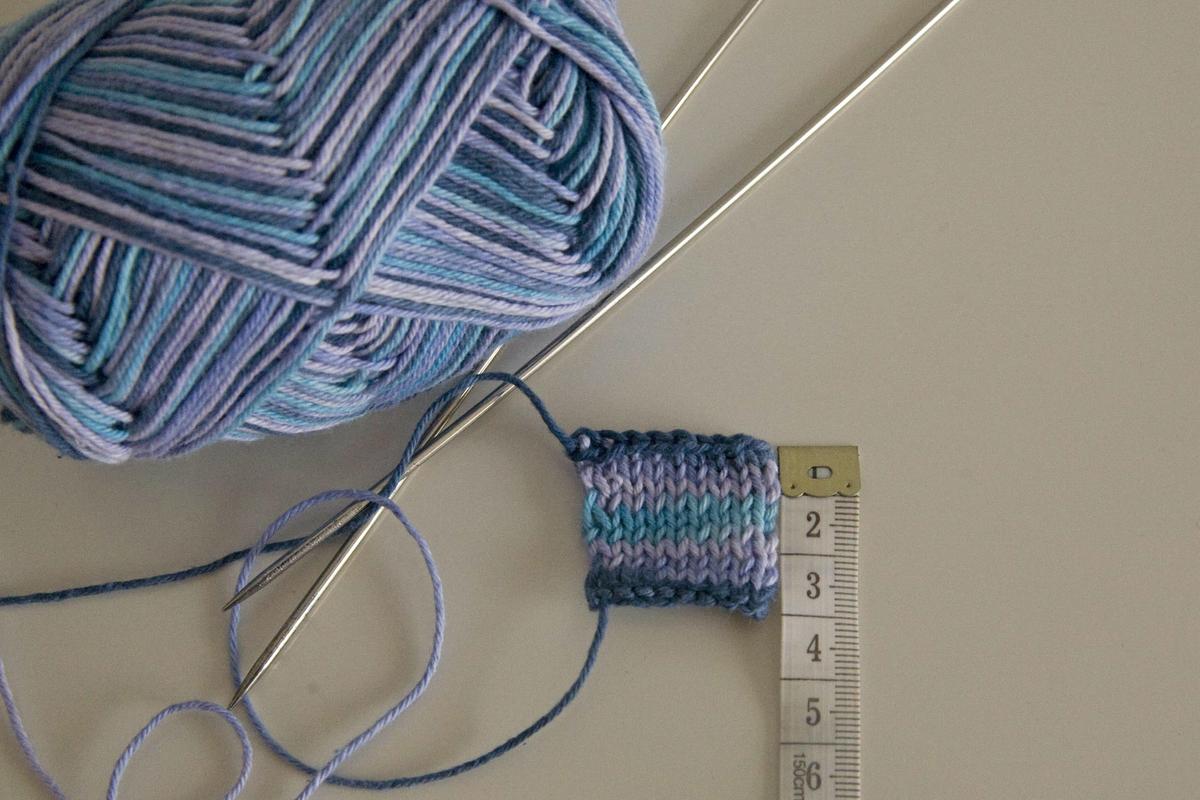 Como para cualquier otra prenda, lo primero que necesitas es tejer una pequeña muestra con la lana y las agujas que vayas a utilizar. Monta diez puntos y teje diez vueltas a punto jersey (alternando una vuelta del derecho y otra del revés), cierra los puntos y extiende la muestra para ver cuanto mide.