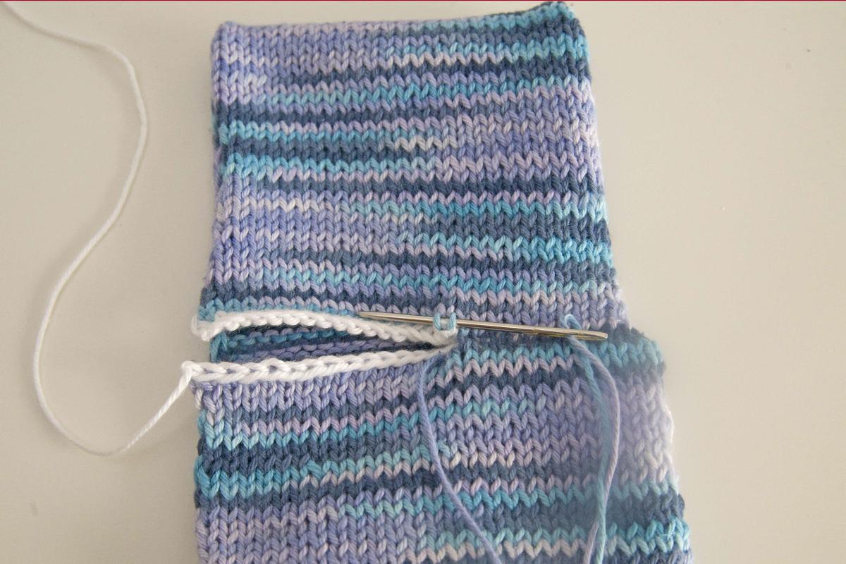Puedes utilizar una lana diferente para montar y cerrar los puntos y hacer una costura invisible, para que no se note la unión de los dos extremos. Puedes ver como se hace en este vídeo.