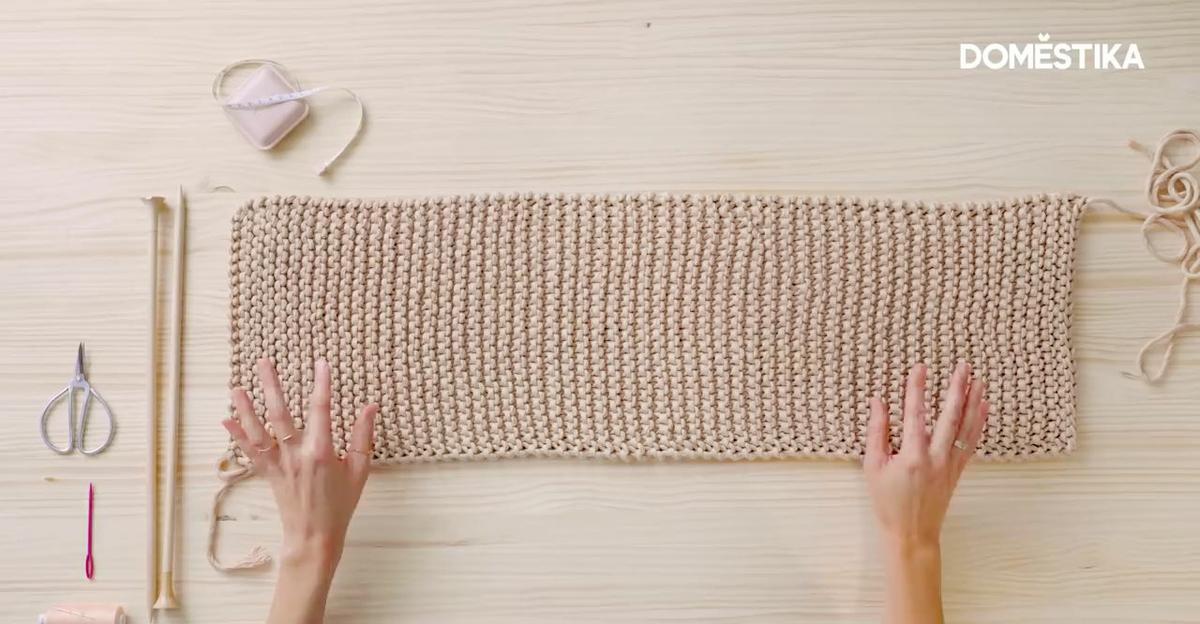 Inserta la segunda aguja de izquierda a derecha de modo que las agujas queden en forma de cruz (la izquierda debe ir por encima y la derecha por debajo) y comienza a tejer los puntos. Una vez que tengas un número de vueltas suficientes, usa la cinta métrica para medir el ancho y asegúrate de que mida 28 cm. Luego, continúa tejiendo vueltas hasta completar la medida de largo del rectángulo, que será de 78 cm. Al terminar, cierra los puntos como se indica en el tutorial.3. Usa la técnica origami para dar forma al bolso origami de punto