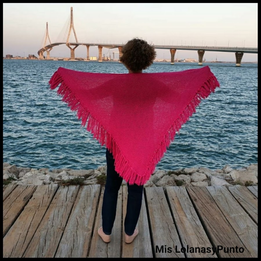Tengo que decir, que este bonito y sencillo chal, no lo he tejido yo. Lo ha hecho mi madre. Pero eso sí, le enseñé a tejerlo, y he sido yo quien le ha puesto los flecos. También soy la "modelo".