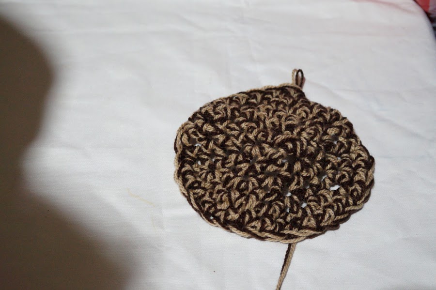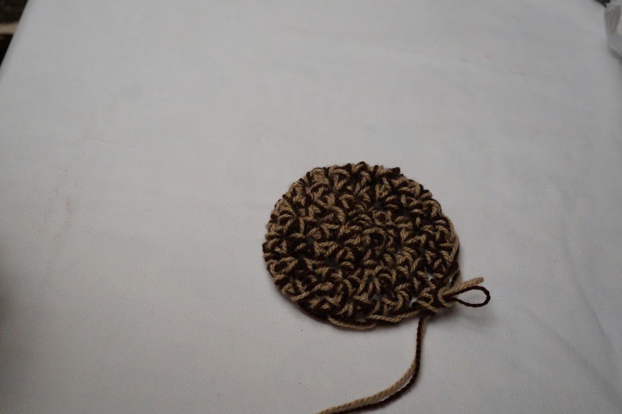 Haremos, con los dos hilos de estambre, un nudo, dejando un orificio para que entre nuestro dedo indice. este lo metemos en el orifico y empezaremos a tejer como si fuera una aguja, jalando el hilo hacia adentro del orificio y haciendo con esto una cadena. De ahí en adelante, haremos una vuelta y cerraremos para que nos quede unido en otra vuelta, colocando dos cadenas por cada cadena base de nuestra primera vuelta. Así hasta completar otra vuelta y haremos otras cuatro vueltas alternando una cadena por dos, una por dos. Así nos quedará: