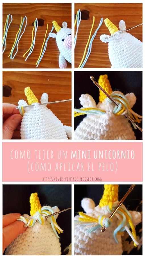 Para hacer el pelito, sólo deben cortar hilos de diversos colores de 10 cm de largo. En total necesitaremos 12 hilos. 4 grupos de 3 hilos cada uno. Damos vuelta el unicornio. Justo abajo del cuerno pasamos la aguja por el tejido, enganchamos las tres hebras y las pasamos de un lado al otro. Luego hacemos un nudo para que no se salgan. Repetimos lo mismo con el resto de las hebras. Siempre hacia abajo para que queden en fila vertical. Igual a la cresta del caballo.Y ya está!!! Ya tenemos un hermoso unicornio!! ;)