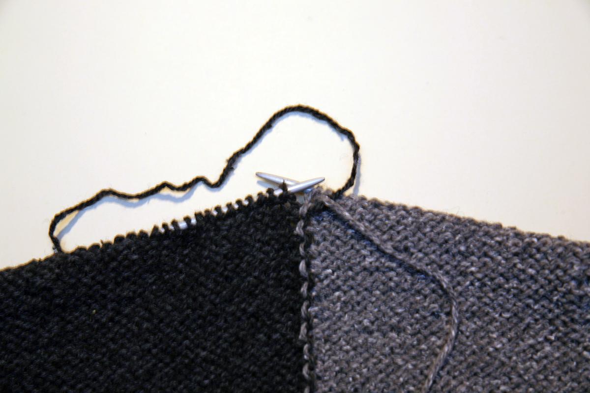 Para cambiar de color sólo hay que tener en cuenta que la hebra del color con el que empezamos a tejer quede por debajo de la hebra del color con el que terminamos, así se van entrelazando los dos hilos y el tejido queda continuo pero con dos colores.