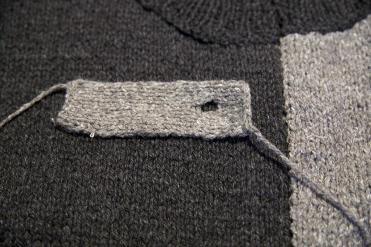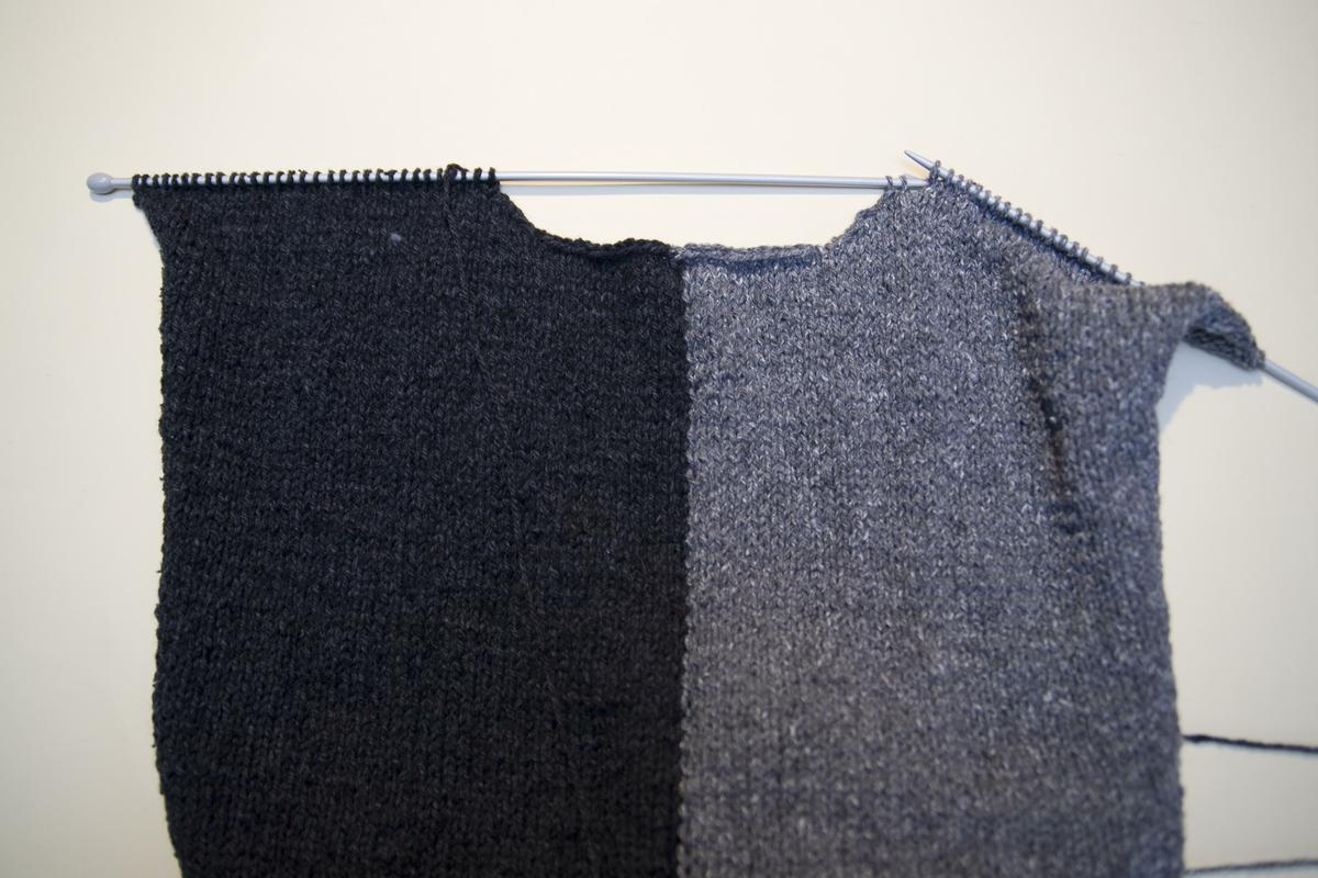 Cada delantero mide la mitad que la espalda más 4 o 5 puntos y el elástico es de color oscuro, aunque al empezar el punto jersey uno de los delanteros se teje con el color claro. A mitad de la altura cambiamos de color como hemos hecho con la espalda, y un poco antes de llegar al final, cerramos los puntos necesarios para darle la forma al cuello. Los puntos de los hombros no se cierran, se dejan en espera como hemos hecho con la espalda.