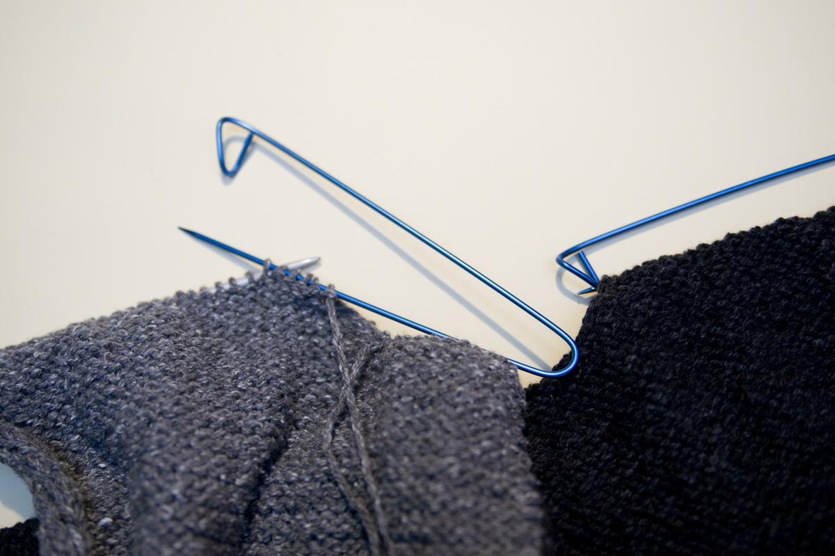 Pasamos los puntos de los hombros a unas agujas auxiliares y los dejamos a la espera.