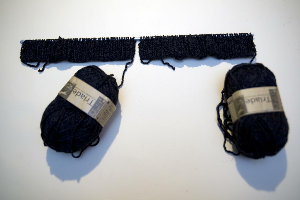 A continuación tejemos una muestra de 10 puntos de ancho que nos servirá para calcular cuantos puntos tenemos que montar para hacer la chaqueta (montar un número par de puntos, para poder dividir la labor en los dos colores que se utilizan).