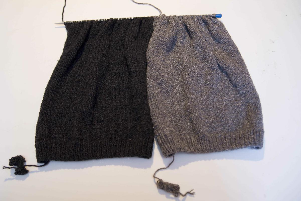 Comenzamos por la espalda. El elástico está realizado alternando un punto del derecho con uno del revés y tiene 10 vueltas de alto. Es todo en color gris oscuro. A continuación continuamos tejiendo a punto jersey, alternando una vuelta del derecho y otra del revés y cambiando de color cuando llevemos la mitad de los puntos tejidos.