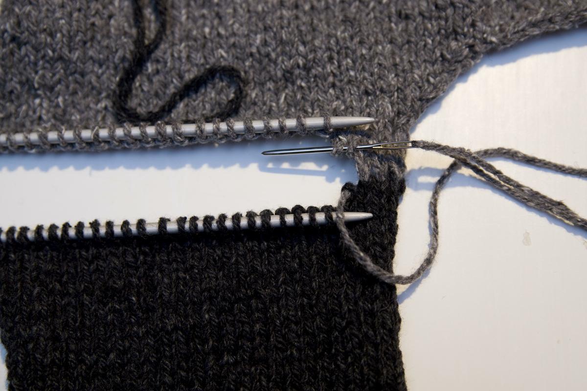 Volvemos a colocar los delanteros y la espalda en las agujas de tejer y los unimos con punto invisible para que no se note la costura. Vamos uniendo dos puntos de la parte de arriba y luego dos de la parte de abajo de forma que nos quede una V, igual que las vueltas tejidas con las agujas.