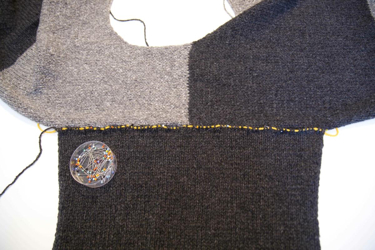 Una vez que hemos unido la espalda con los dos delanteros, cosemos las mangas. Sacamos los puntos de las mangas de las agujas pasando un hilo de contraste, para que no se nos escape ningún punto. Colocamos las mangas sobre el jersey tomando medidas para que queden bien centradas y las cosemos con un pespunte. Una vez que están unidas tiramos del hilo de contraste para quitarlo.