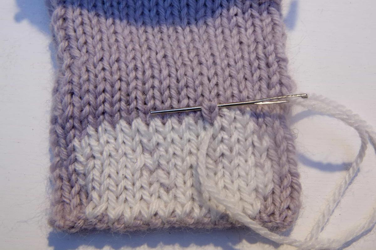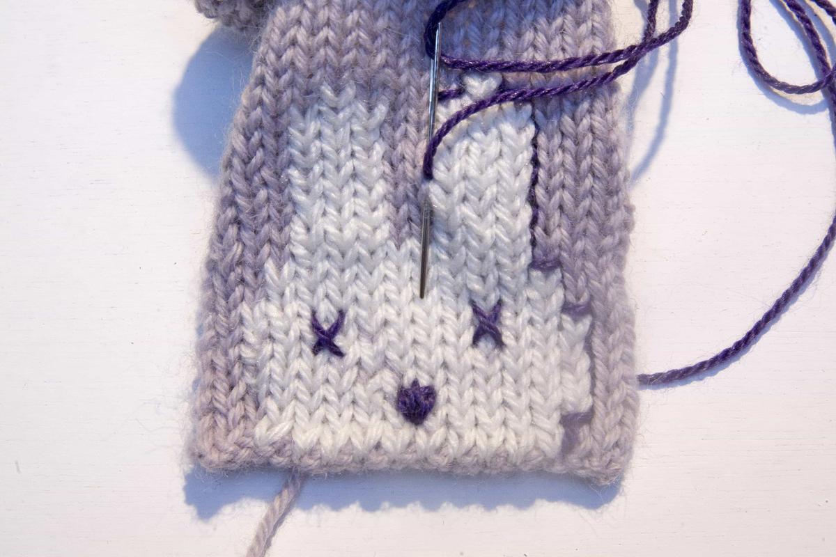 Con la bolsa terminada es el momento de bordar un dibujo. Yo he seguido las puntadas con la aguja lanera haciendo un falso jacquard que imita los puntos del tejido. En este video puedes ver en detalle como se hace el falso jacquard.