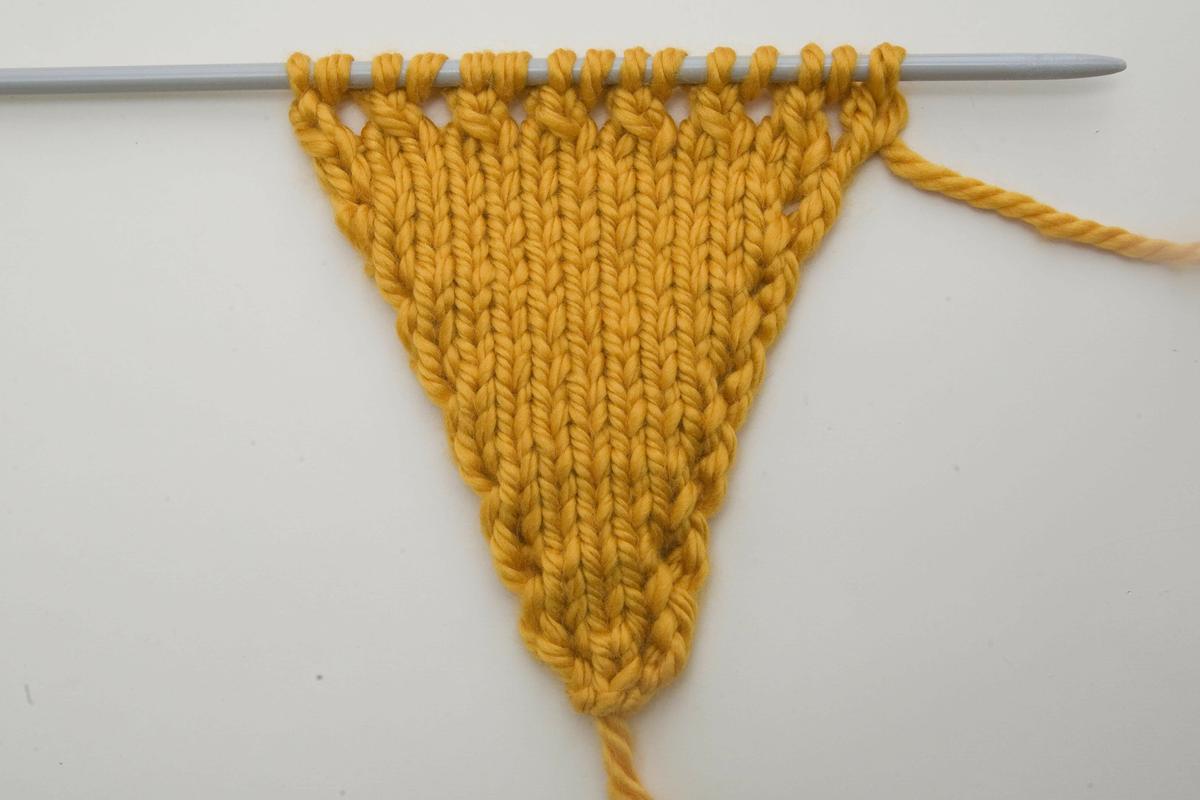 La siguiente vuelta la tejemos del derecho sin aumentos y la otra del revés también sin aumentos. Si pasas el primer punto de cada vuelta sin tejer, los bordes del banderín quedarán mejor.