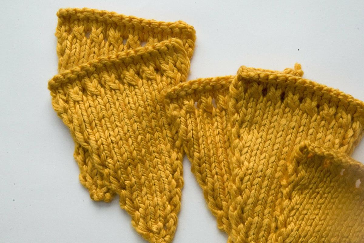 Cuando tengamos el tamaño de banderín que nos guste creamos los agujeros para pasar el cordón. Se teje el primer punto, se pasa la hebra por delante de la aguja y se tejen los dos siguientes puntos juntos. Así hasta que terminamos todos los puntos sobre la aguja