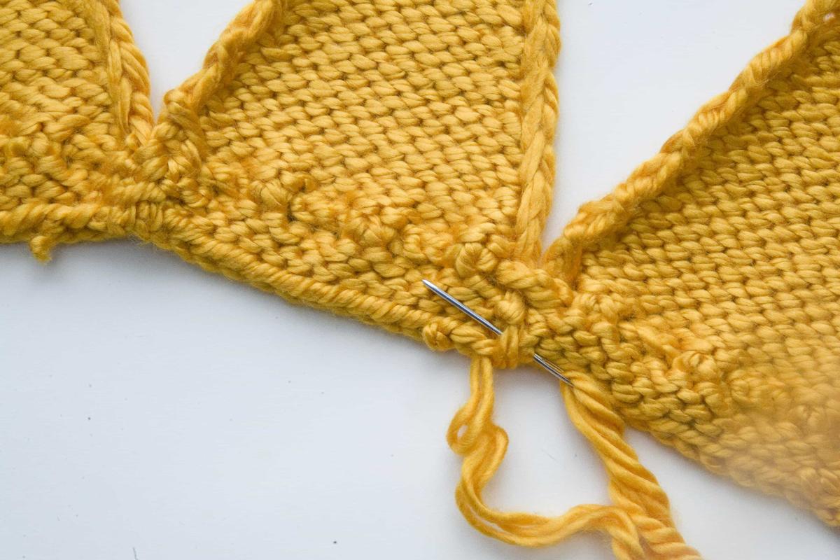La siguiente vuelta la tejemos del revés y luego cerramos los puntos y rematamos las hebras del principio y del final de la labor.
