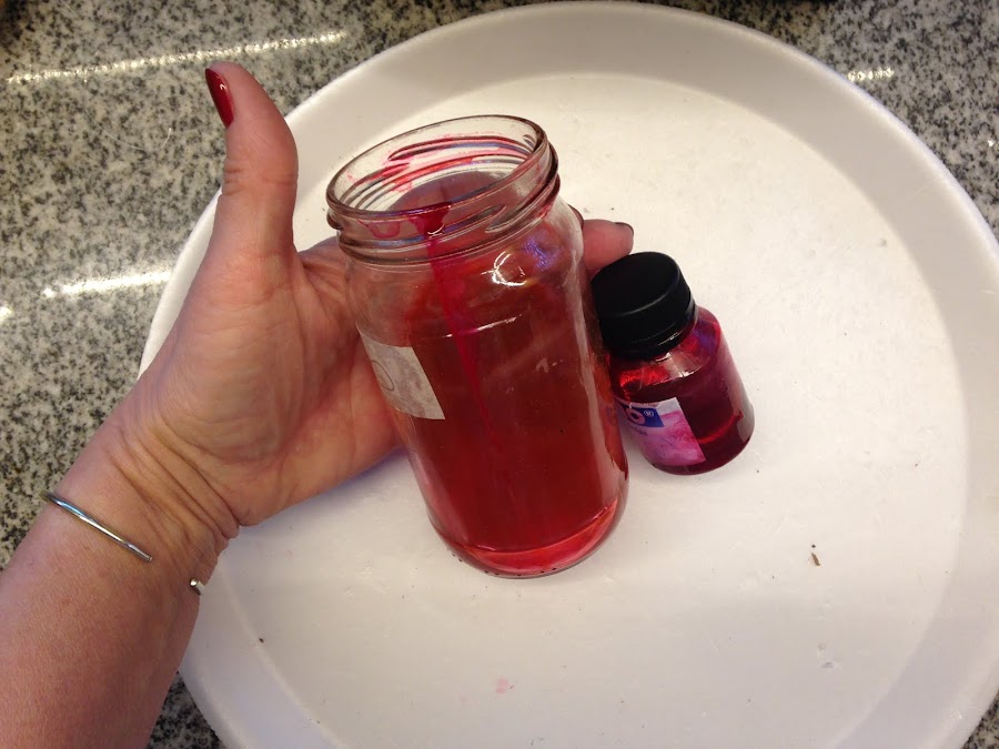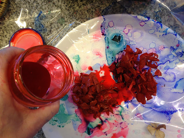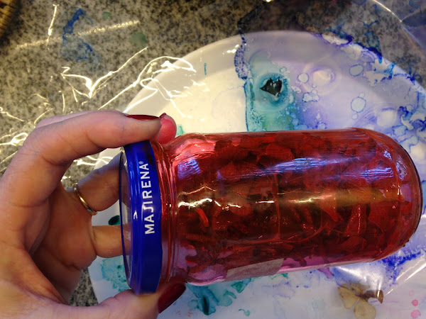 Cortar en trozos la flor y colocarla en el recipiente con el líquido, agitar cada tanto. recordar poner protectores plásticos para trabajar. Si se quiere poner la flor completa será necesario un recipiente más grande.