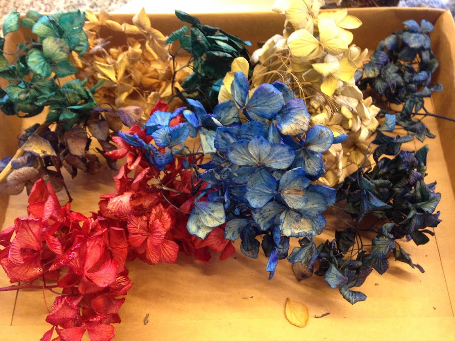 Estas son hortensias de mi casa, cuando comenzó el otoño corté las flores que estaban casi secas y las deje un tiempo colgadas hacia abajo para que se terminen de secar. Pero el color que queda no tiene nada que ver con la flor que adorna nuestros jardines, es un ocre claro, parejo. Si tenes idea de colorear tus hortensias o flores y hojas que tenes recolectadas te dejo una idea para obtener hermosos colores totalmente duraderos.