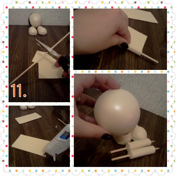 11. para los pies solo necesitas los palilos de brochetas cortalos a unos 15cm y enrolla el foami en ellos....