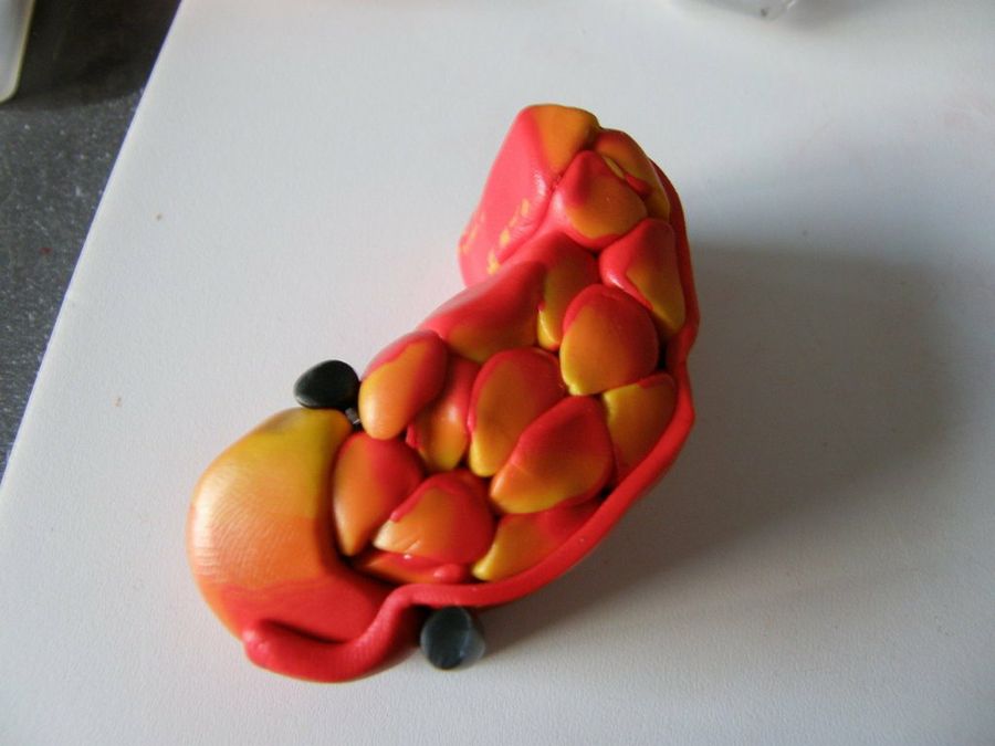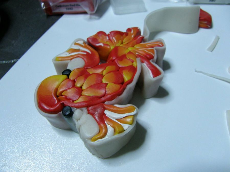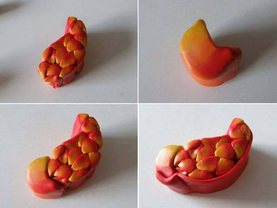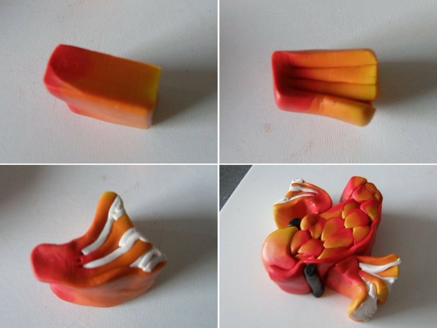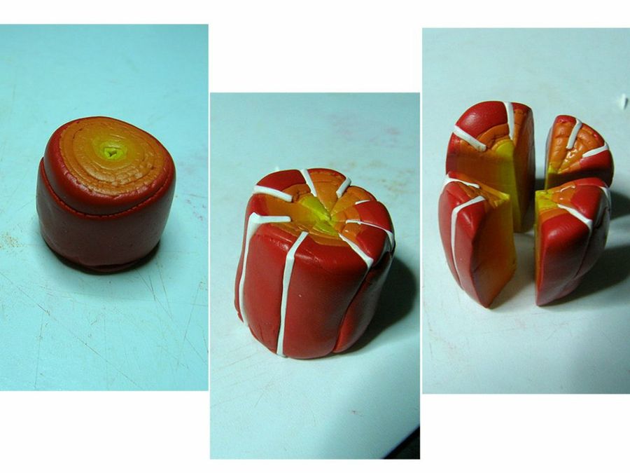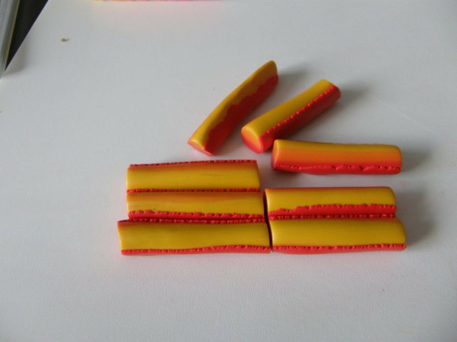 "Reducimos los bloques resultantes hasta obtener un tubo bastante fino, que dividiremos en ocho tubitos iguales, y los recubriremos parcialmente con una lámina de rojo. Damos forma de gota a los tubitos", sigue explicando nuestra forera Eleojota.