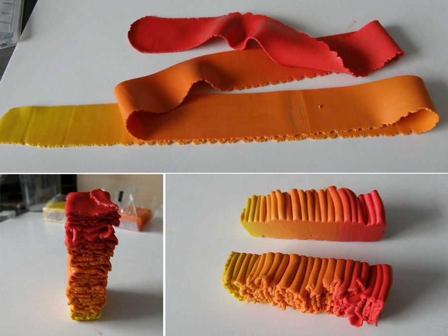 "Una vez conseguido el degradado, lo pasamos nuevamente por la laminadora cada vez más fino hasta que obtenemos una tira estrecha y fina. Disponemos la tira en zig-zag en sentido horizontal para hacer un bloque, y lo cortamos por la mitad".