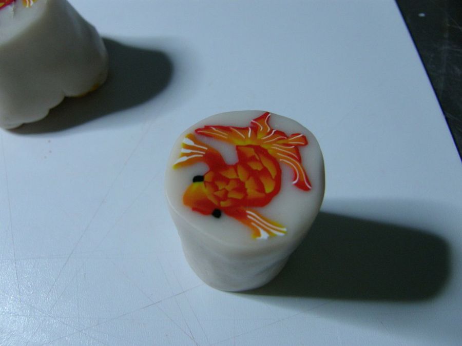 El plan de la artista es modelar un pececito, que va cobrando vida ante nuestros ojos. "Ahora con esos tubos en forma de gota haremos las escamas del pez: los cortaremos en fragmentos de unos 2 cm de largo, que será el grosor de la murrina antes de reducir, y los disponemos formando el cuerpo del pez. Con un trozo de la otra mitad del bloque inicial damos forma a la cabeza, y la acoplamos al cuerpo".