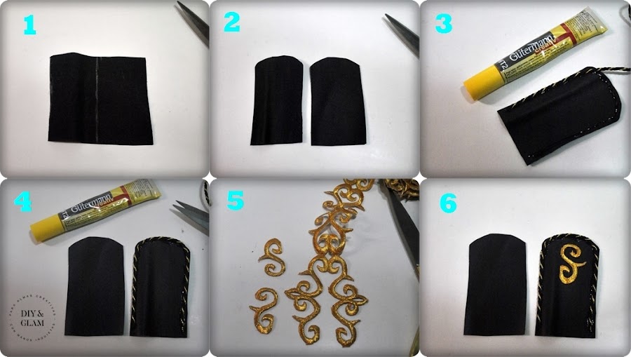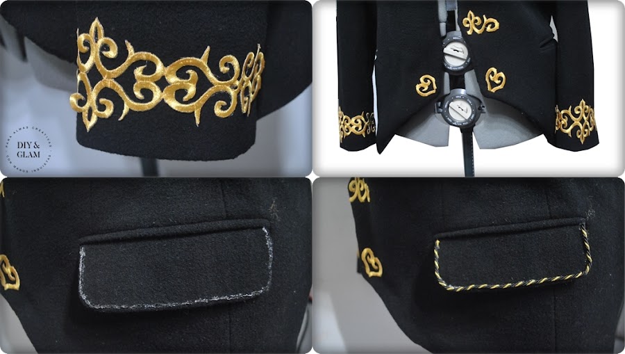 En la solapa de los bolsillos pegamos el cordón dorado y negro.