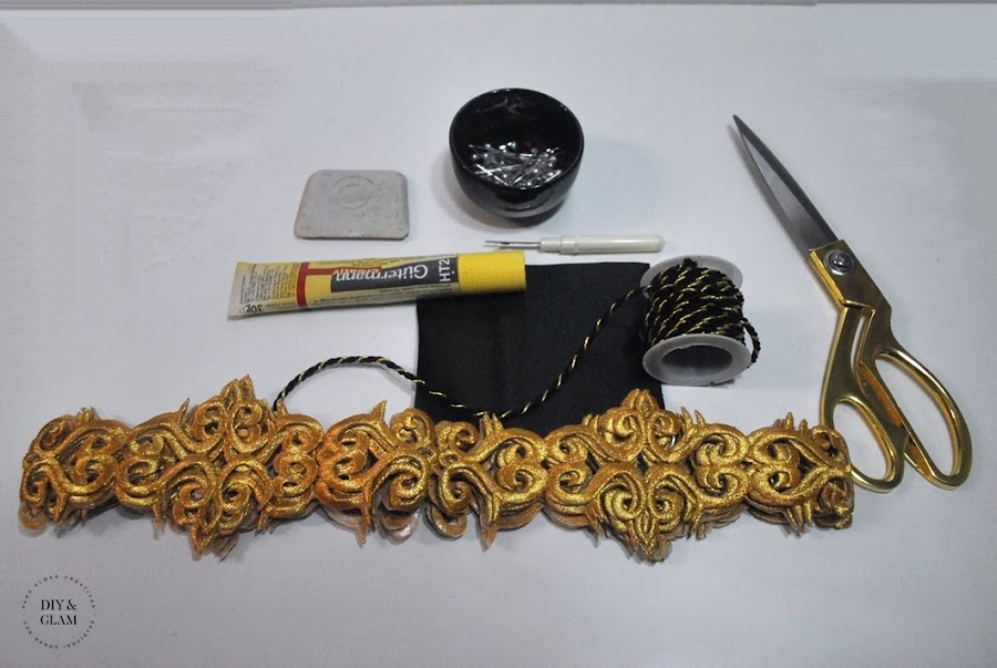 Cortamos 2 trozos de pasamanería. (la que yo he elegido es muy ancha y con filigranas)