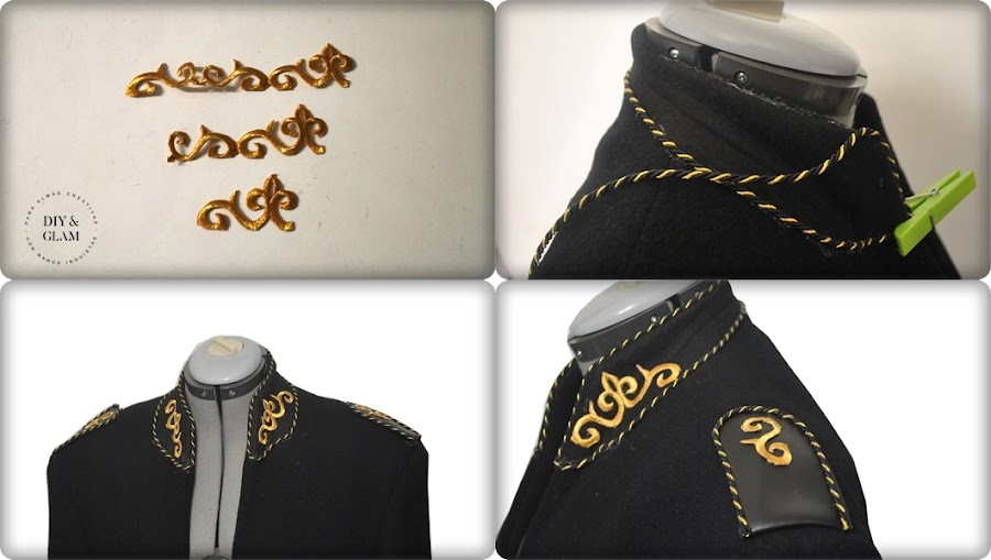 Y en el frontal de la chaqueta pegamos 4 tiras de pasamanería, de más grande a más pequeña. Esto nos sirve para adornar la chaqueta y además aprovechamos para tapar los ojales.