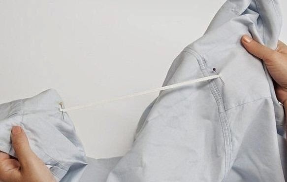 1.Con un alfiler ubica la zona del hombro donde coserás el elástico a lo largo de la manga hasta llegar antes de la muñeca de la camisa.