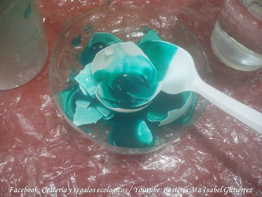 Aparte, preparamos la pintura mezclando con poca agua, sumergimos los cascarones y los dejamos una hora para que se impregnen bien...