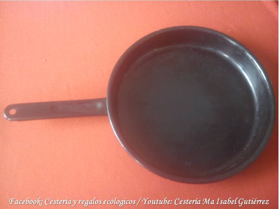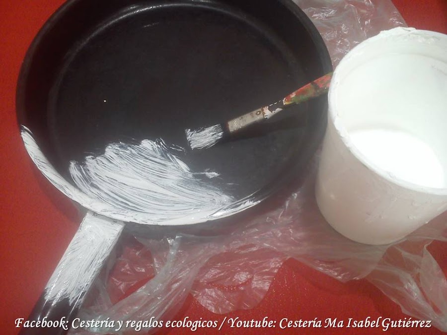 Pero primero vamos a pintar la sartén en color blanco, lo estoy haciendo con pintura vinílica con base de agua, pero casi todo tipo de pintura nos puede ser útil...