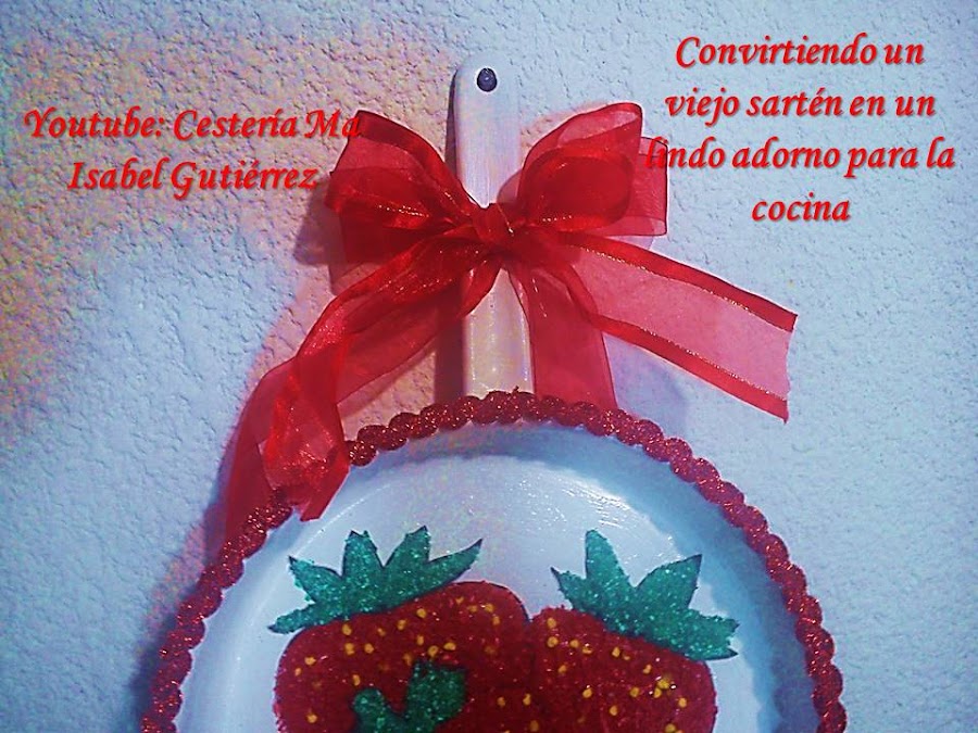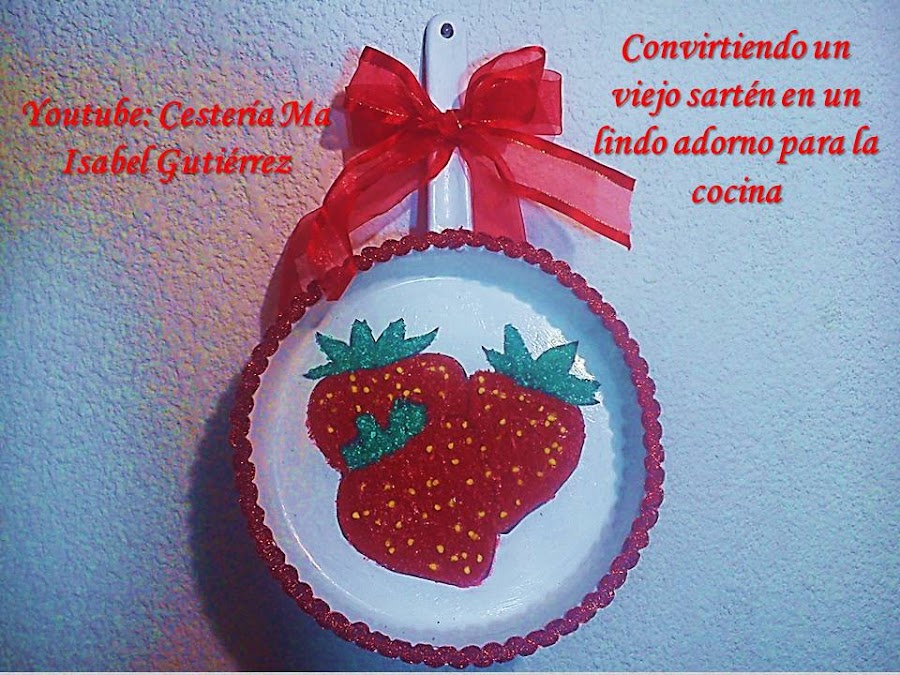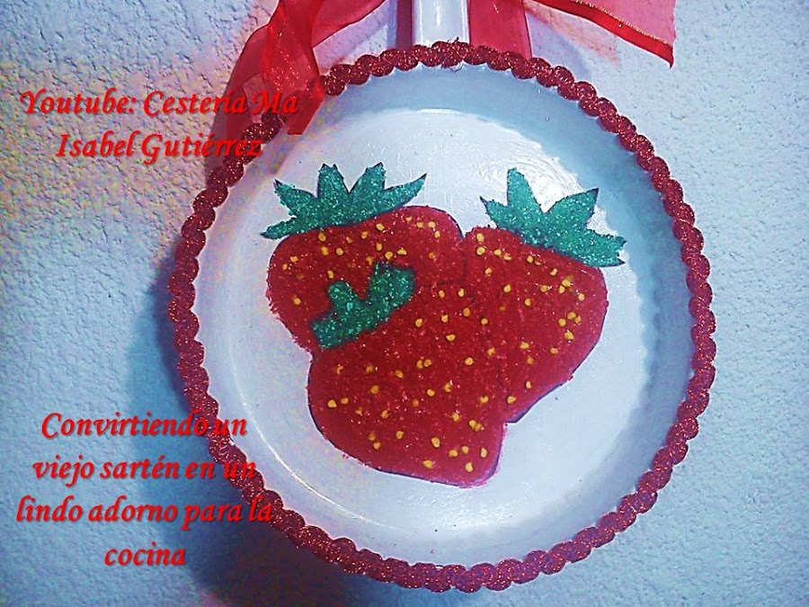 Con silicón, pegamos las semillas, y para terminar, enmarcamos la sartén pegando con silicón una cinta o listón lindo alrededor...