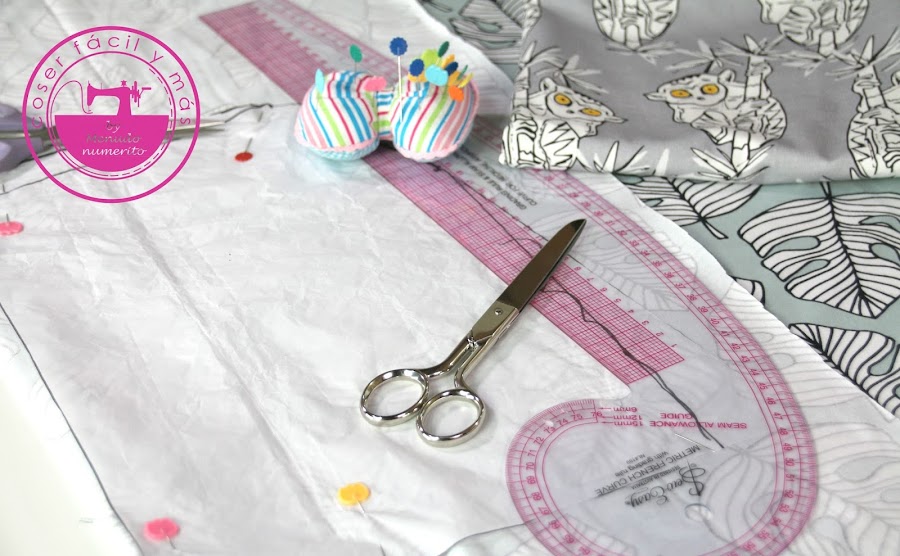 Lo vas a ver paso a paso en el vídeo pero básicamente una vez hayas trazado el patrón, no tienes más que doblar la tela enfrentando los derechos, colocar el patrón encima, sujetar con alfileres y cortar dejando márgenes de costura.