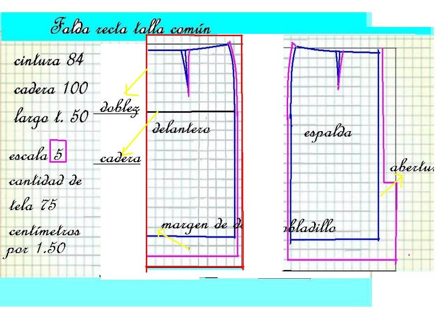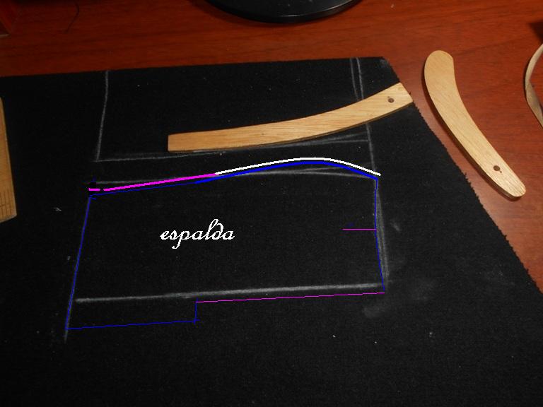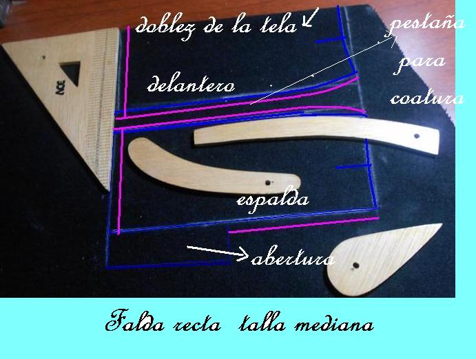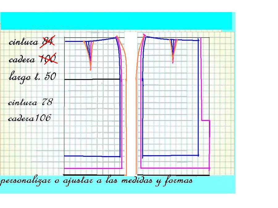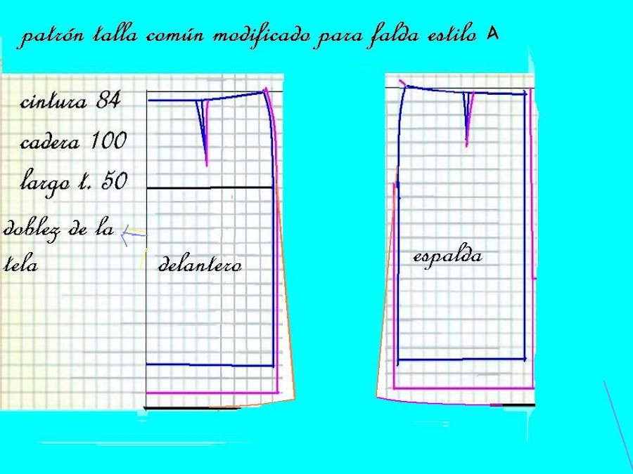 La única diferencia entre el delantero y la espalda es que a esta solo se le baja un centímetro en el centro para unir la linea hacia el lateral, y en caso de llevar el cierra atrás, lleva el aumento para la costura y la abertura necesaria en telas rígidas, las faldas con abertura y cierre al costado tienen una sola diferencia.