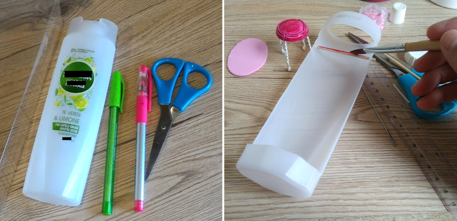 Con un bote de shampoo he formado el armario, abrí por el frente, corté la parte superior que no era estética y la tape con goma eva