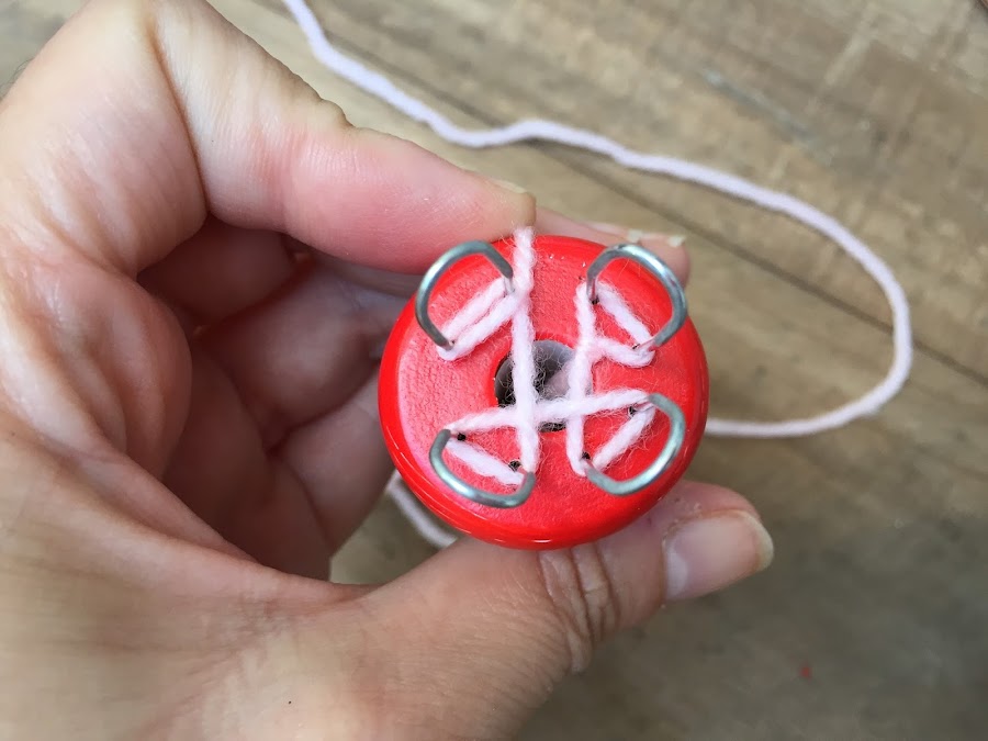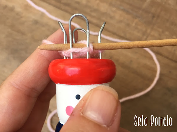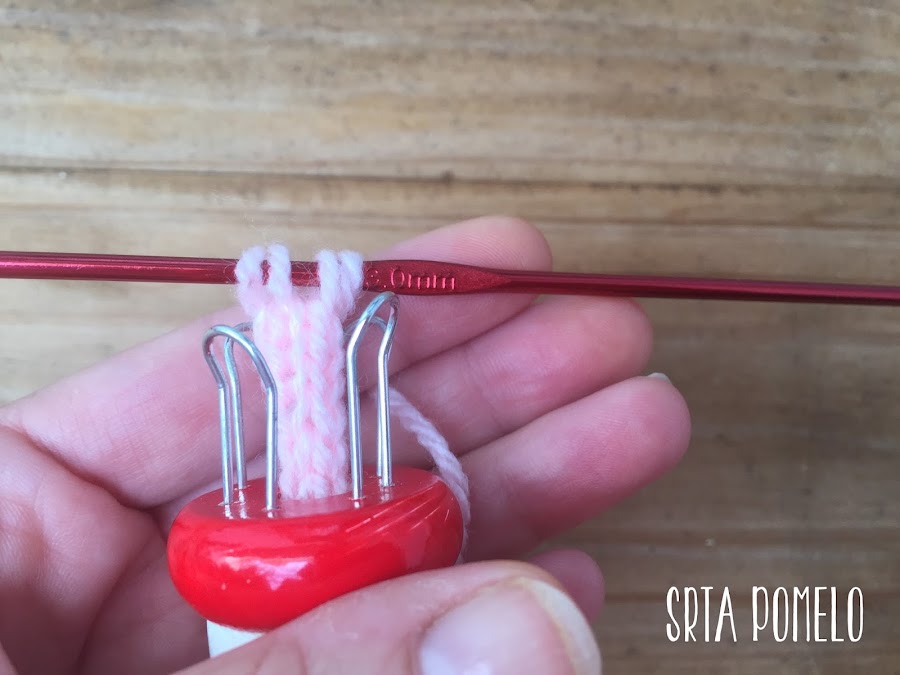 Se inserta el nudo en uno de los clavitos del tricotín y se tira para apretarlo (pero no demasiado, que quede un poco holgado). La hebra sobrante se introduce dentro del hueco central.