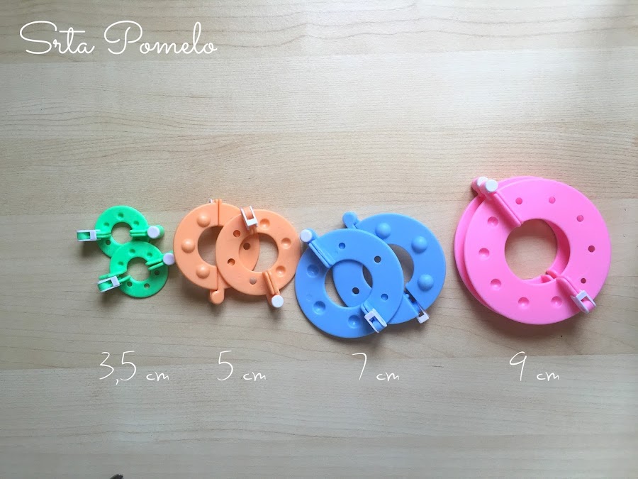 Estos que yo adquirí no me costaron más de 8€ y venían en una caja de cartón, con unos gráficos explicativos de como se usan. En la caja había discos de 4 tamaños distintos para hacer pompones de distinto diámetro. Os dejo las medidas en la imagen de abajo.