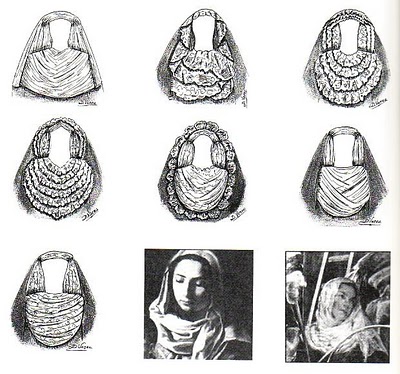 Tiempos atrás, las imágenes de las Vírgenes solían estar vestidas de riguroso luto y el tocado se reducía a un sencillo rostrillo que se prolongaba y anudaba al cuello como si fuera un pañuelo.