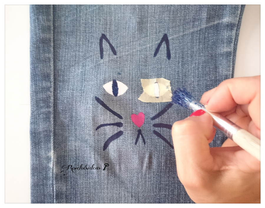 Paso 5: Con la pintura textil azul marino, pintar los bigotes y las orejas con mucho cuidado tratando de dar pequeños toquecitos con el pincel.