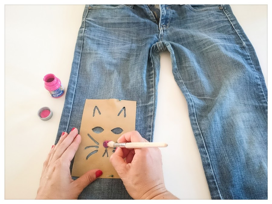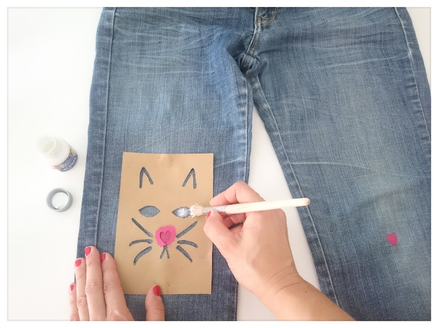 Paso 3: Colocar la plantilla encima del jeans y situarla a la altura de la rodilla, después utilizar un par de alfileres para poder sujetarla, así evitar que se nos mueva, una vez decidido el lugar donde irá comenzar a pintar con un pincel y la pintura textil rosa el corazón de la nariz.