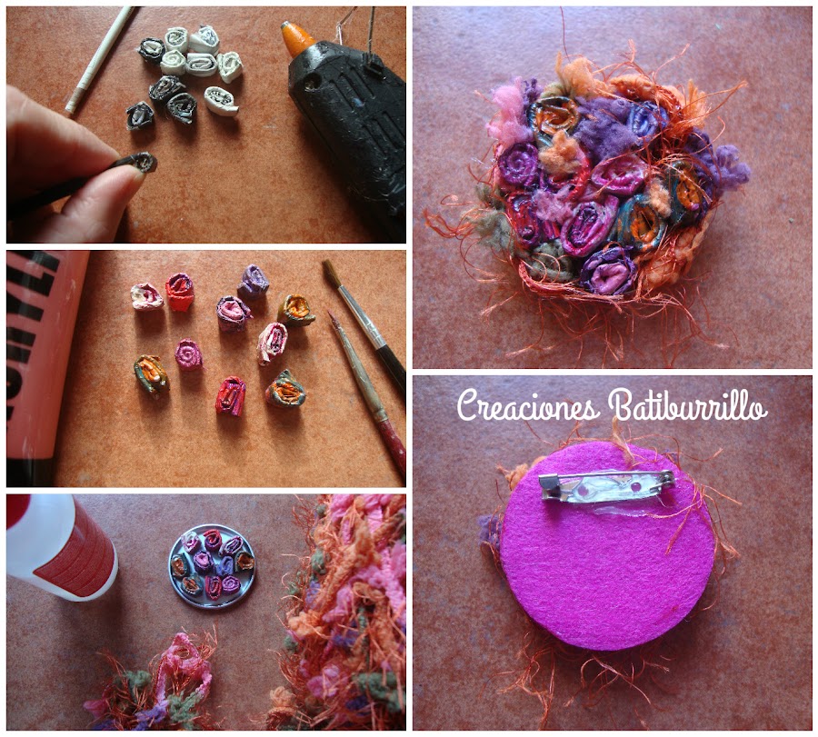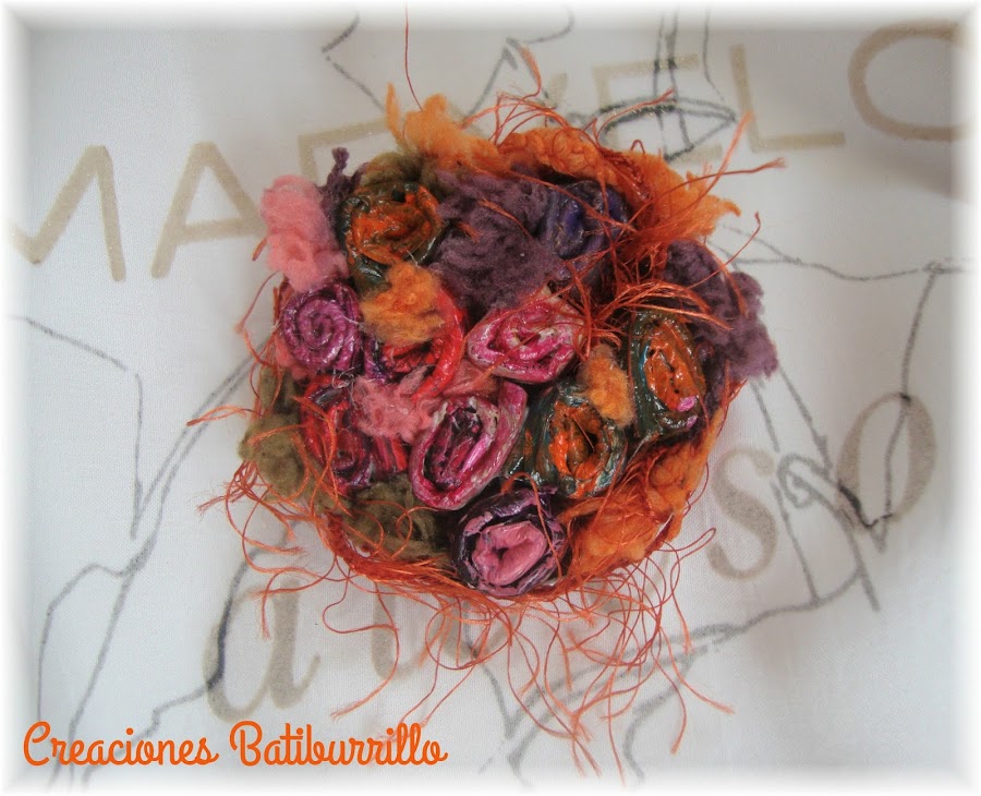 Hice una primera prueba para ver cómo iría la distribución de las flores (foto), después las saqué. Cubrí la base con silicona líquida y pegué una especie de cama de lana repartiendo las motas y flecos. Sobre ella, en un segundo tiempo fui distribuyendo y pegando las flores de papel tal y como lo había planificado antes, despeinando algunos hilos entre ellas y por el borde del conjunto.