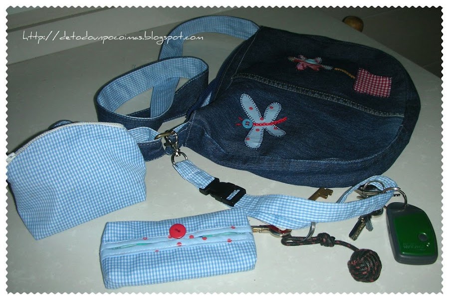 Con la misma tela de cuadritos que forré el bolso he hecho este mini-neceser tilda y el famoso guarda pañuelos, los dos mas vistos que el TBO... pero como son los primeros que hago yo, me hace ilusión ponerlos. Y como soy un desastre con las llaves, que las voy dejando olviadas en todas partes, he aprovechado una cinta de esas que dan de propaganda, la he tuneado un poquito, y la he enganchado a la anilla del bolso, así, cuando las busco entre tantos cachivaches que llevo dentro, solo tengo que tirar de ella.... Lo malo será si me olvido el bolso......