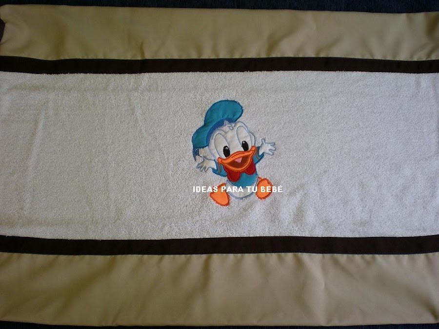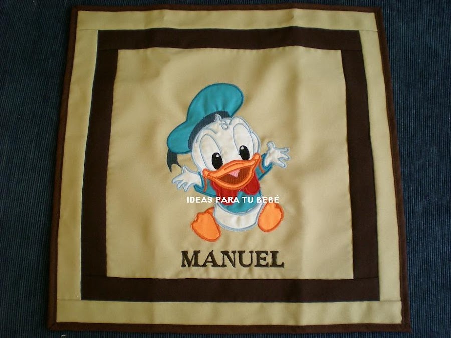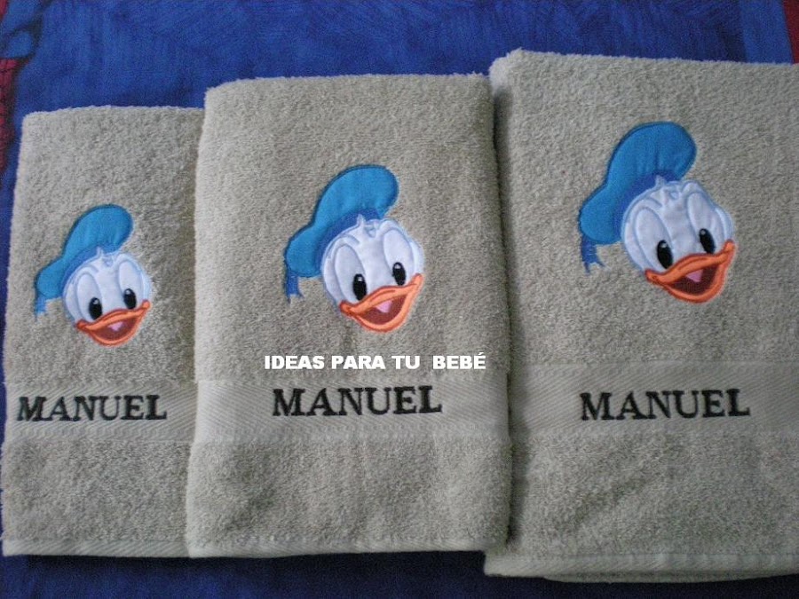A pedido de Sofía, he terminado estos complementos para la habitación del pequeño MANUEL que viene en camino. Se ha confeccionado un juego de toallas con el diseño bordado de baby donald, un albornoz, capa de baño, funda de cambiador, neceser y un cojín infantil con el nombre del bebé.