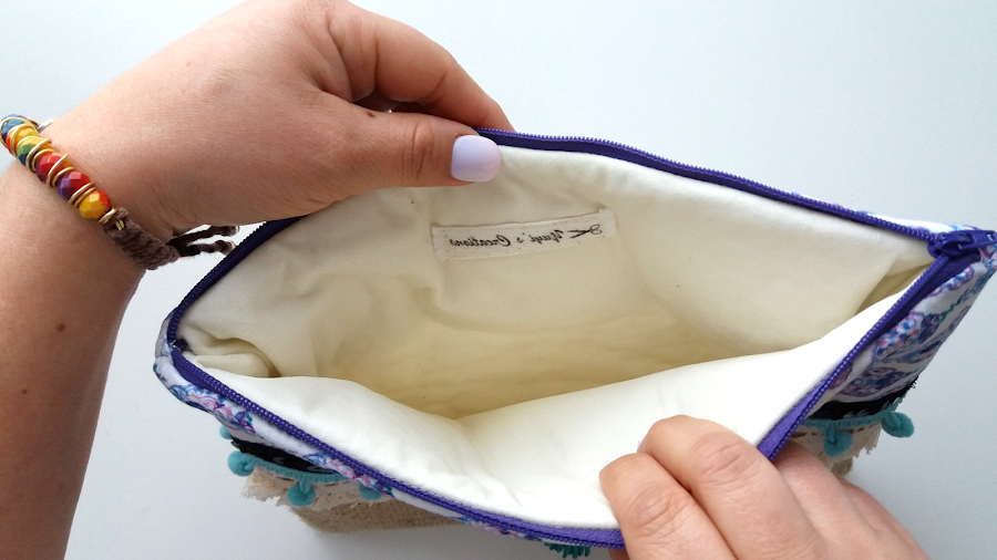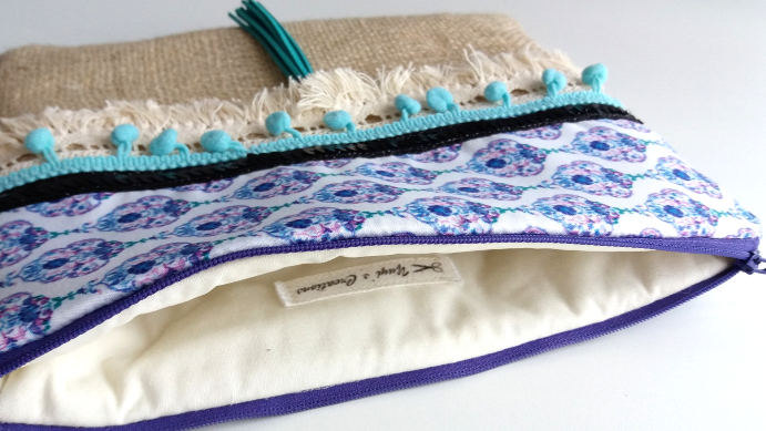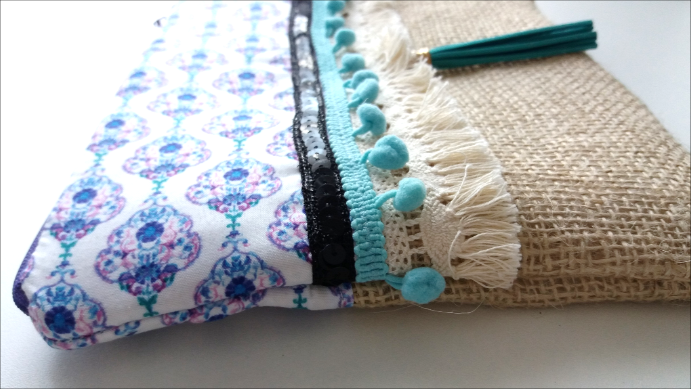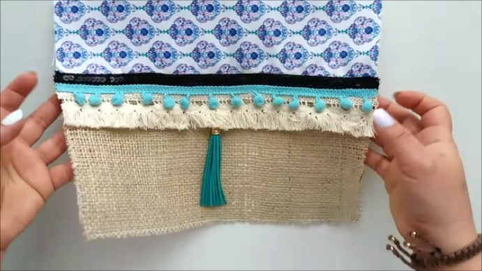 Empezamos decorando la parte exterior, yo sólo lo he hecho en lo que será la cara principal del bolso. Le puse una pieza de tela estampada y los flecos, pompones etc. además de una pequeña borla en medio.