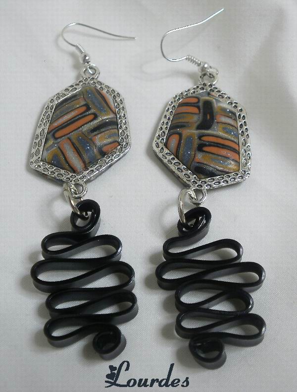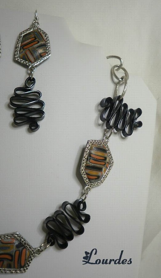 Este conjunto de collar y pendientes está realizado con esta composición de rectángulos en colores gris, naranja, negro y nácar. La masa va horneada con piezas metálicas He completado el conjunto con alambre plateado grueso